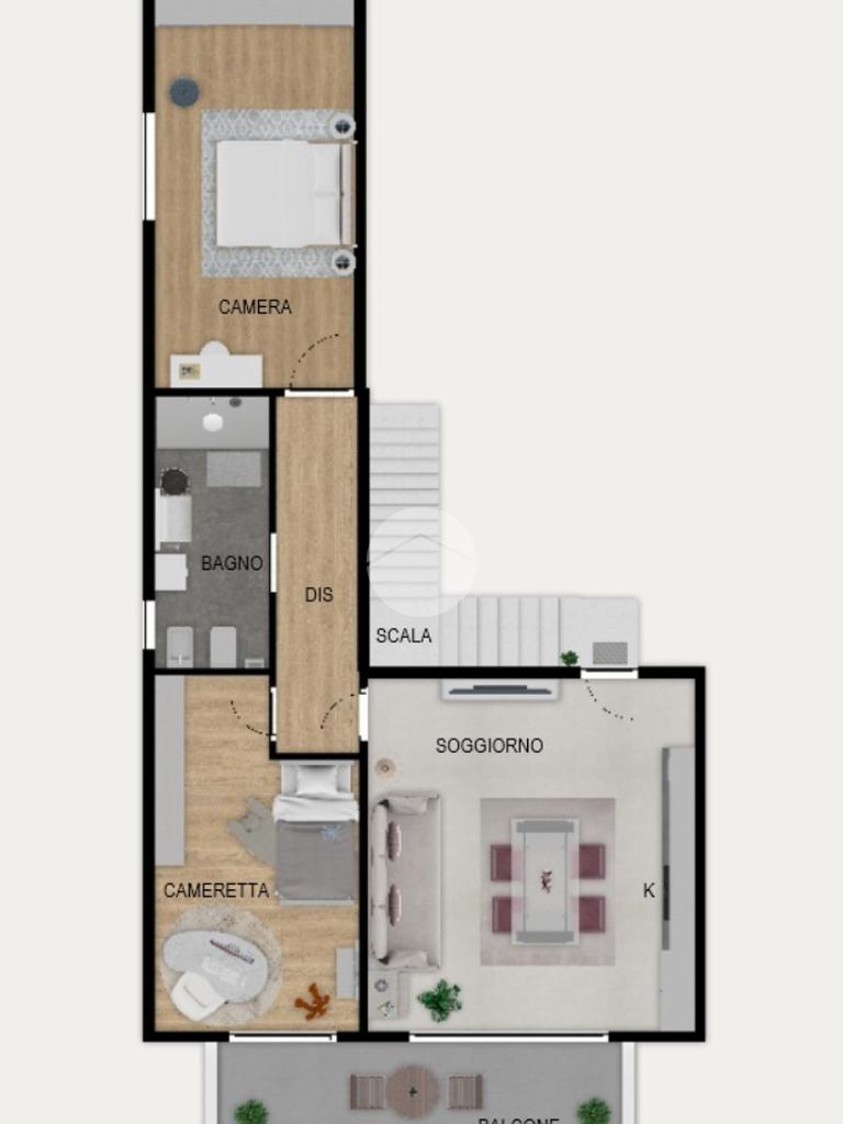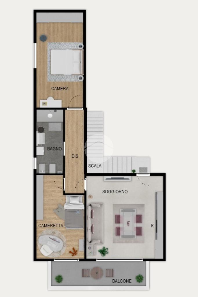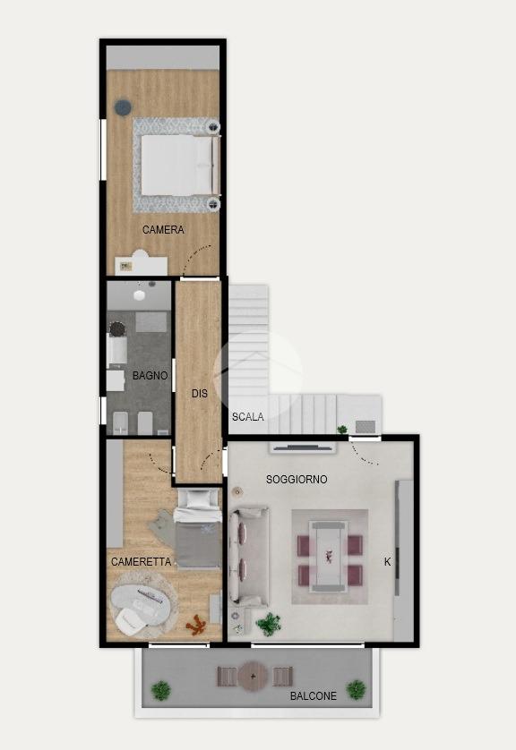 Collocato al secondo ed ultimo piano, accessibile da un'elegante scala rifinita in serizzo, è caratterizzato dalla doppia esposizione sud-ovest. Dall'ingresso accediamo al grazioso soggiorno a pianta quadrata con cucina a vista, dotato di ampia portafinestra che rende l'ambiente luminoso, con affaccio sul balcone privato. Il disimpegno separa la zona notte, così composta: camera matrimoniale, cameretta con sfogo esterno sul balcone e bagno finestrato con doccia.